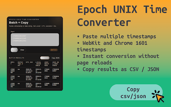 Denna tillägg för Chrome fungerar offline, vilket gör den både snabb och privat. Användare kan enkelt klistra in flera tidsstämplar för att konvertera dem i en tydlig tabell, och resultaten kan enkelt exporteras som CSV eller JSON. Med en ren och minimalistisk design, samt integration i adressfältet, erbjuder Epoch Unix Time Converter en effektiv lösning för alla som behöver arbeta med tidsstämplar.